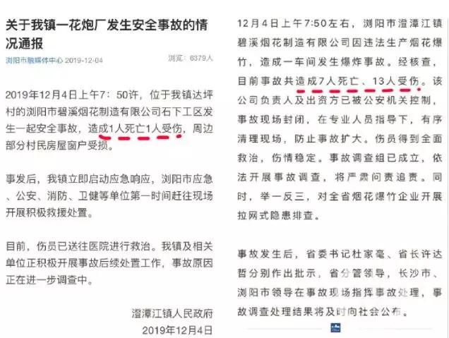 12月4日7时32分许,湖南省浏阳市碧溪烟花制造有限公司石下工区包装作业区域发生爆炸事故,造成13人死亡、13人受伤。事发当日,当地上报的伤亡情况为7人死亡、13人受伤,湖南省人民政府成立调查组对该事故提级调查,调查发现并核实另有6人死亡。