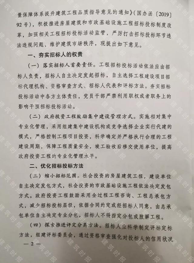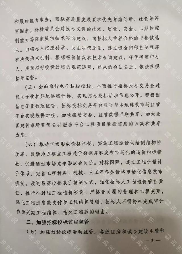 优化招标投标方法,缩小招标范围,政府投资工程鼓励采用全过程工程咨询、工程总承包方式,减少招标投标层级:探索推进评定分离方法,招标人应科学制定评标定标方法,组建评标委员会,评标委员会向招标人推荐合格的中标候选人,由招标人择优确定中标人:全面推行招标投标交易全过程电子化:推动市场形成价格机制,实施工程造价供给侧结构性改革,招标人不得将未完成审计作为延期工程结算、拖欠工程款的理由。