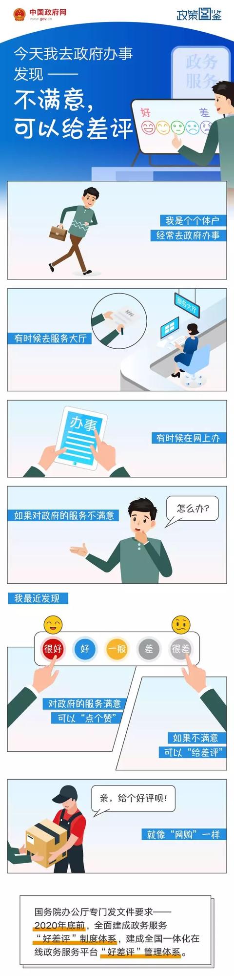 国务院表示:2020年底前,全面建成政务服务“好差评”制度体系,建成全国一体化在线政务服务平台“好差评”管理体系。