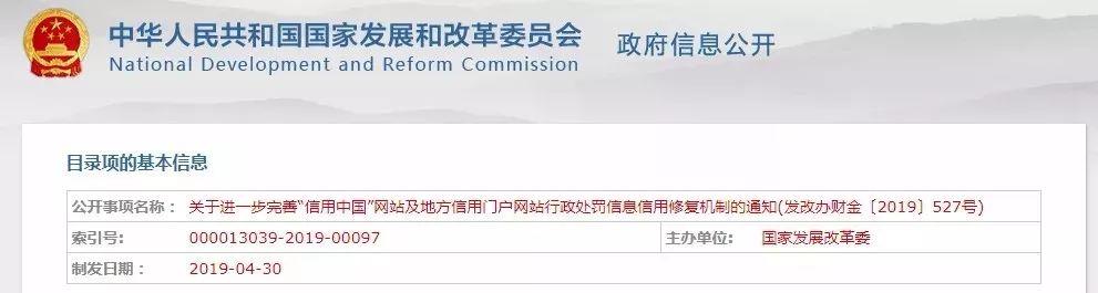 4月30日,国家发改委在《关于进一步完善“信用中国”网站及地方信用门户网站行政处罚信息信用修复机制的通知》中,针对涉及失信行为的行政处罚信用信息修复机制进行了具体规定。