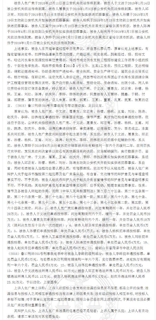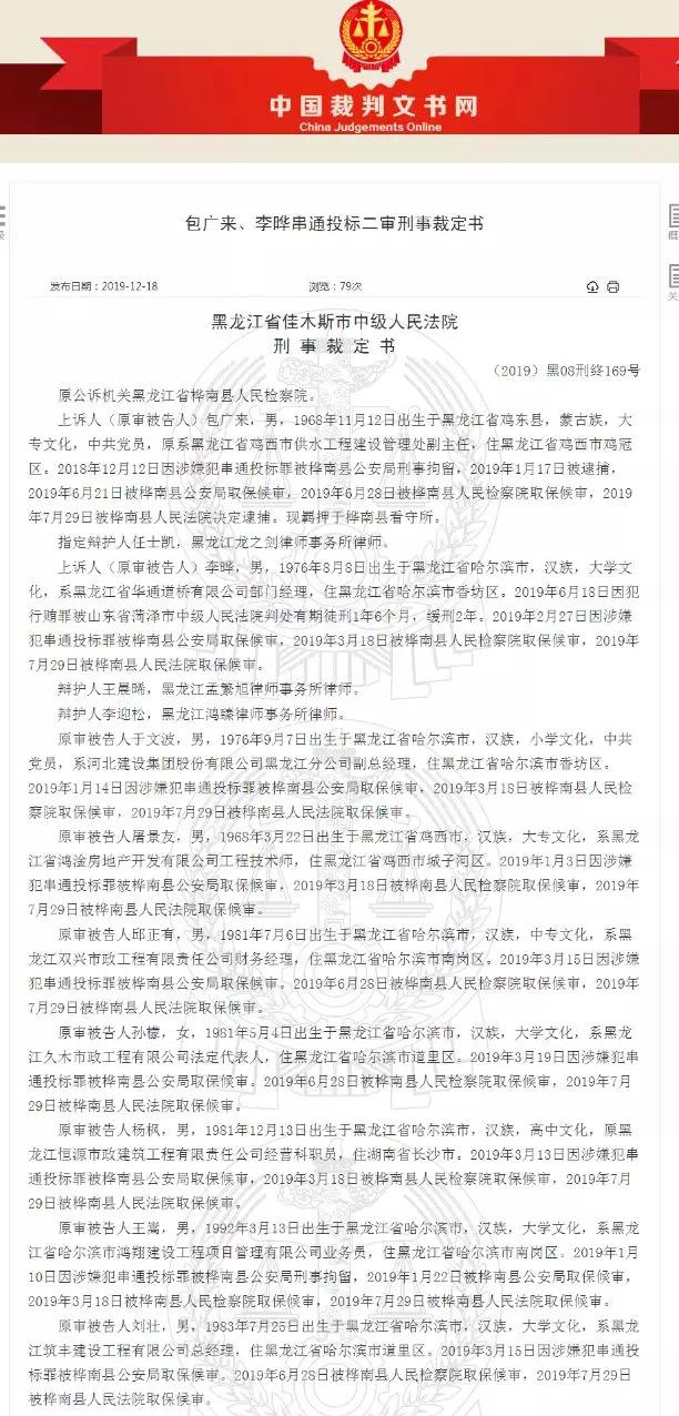 近日,黑龙江省佳木斯市中级人民法院日前公布一起串通投标刑事案件二审裁定书。
