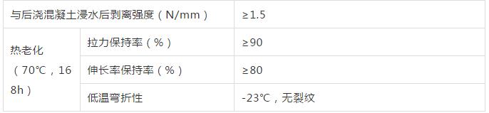 采用预铺反粘法施工时,在卷材表面的胶粘层上直接浇筑混凝土,混凝土固化后,与胶粘层形成完整连续的粘结(这种粘结是由混凝土浇筑时水泥浆体与防水卷材整体合成胶相互勾锁而形成)。高密度聚乙烯主要提供高强度,自粘胶层提供良好的粘结性能,可以承受结构产生的裂纹影响。耐候层既可以使卷材在施工时可适当外露,同时提供不粘的表面供施工人员行走,使得后道工序可以顺利进行。