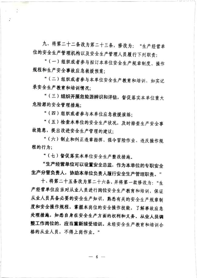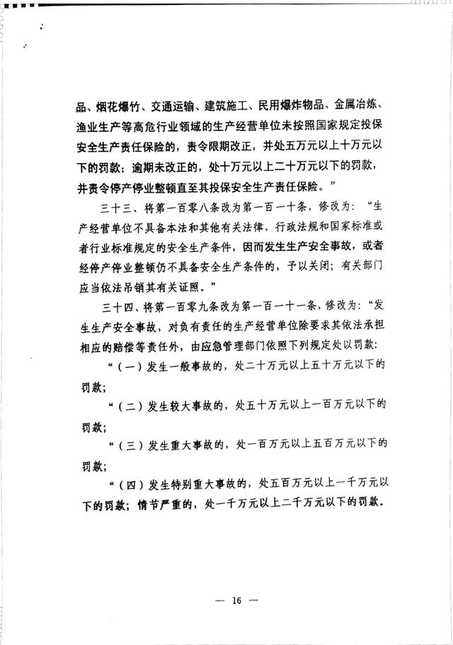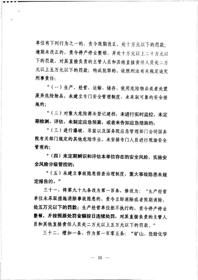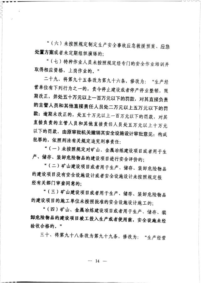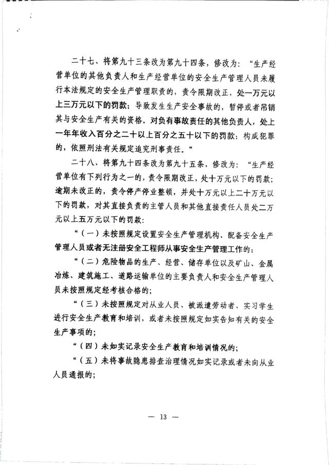 1、将第九十四条第一项修改为:“未按照规定设置安全生产管理机构、配备安全生产管理人员或者无注册安全工程师从事安全生产管理工作的”生产单位出现以上行为的:责令限期改正,可以处五万元以下罚款。