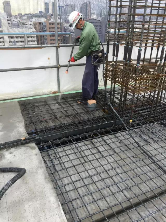 当然,施工现场还是会有一些地方需要现浇混凝土。这是工人在浇混凝土之前用高压水枪清洗施工区域。公众号:安全管理辞典,不允许有任何的垃圾残留。
