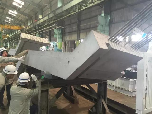 这是在工厂里贴墙砖,工人们把墙砖预先放在模具里,再放上钢筋,倒入混凝土。