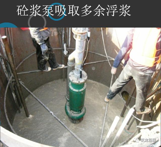 在灌注接近结束时,由于导管混凝土柱高度减小,压力降低,而导管管外的泥浆稠度增加,如出现混凝土面上升困难时,可在孔内加水稀释泥浆,并掏出部分沉淀土,使灌注工作顺利进行。