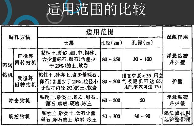 特点:可用于各种地质条件,各种大小孔径和深度,护壁效果好,成孔质量可靠;施工无噪音,无震动,无挤压;机具设备简单,操作方便,费用较低,但成孔速度慢,效率低,用水量大,泥浆排放量大,污染环境,扩孔率较难控制。