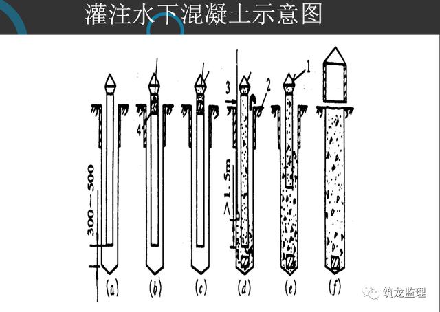 水下灌注混凝土应连续进行,严禁中途停顿。导管在混凝土中埋入深度一般为2~4米,在任何情况下不得小于1米或大于6米。
