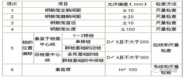 3、钢筋笼加工由项目部质检人员根据下表标准自检合格后向监理工程师报验。