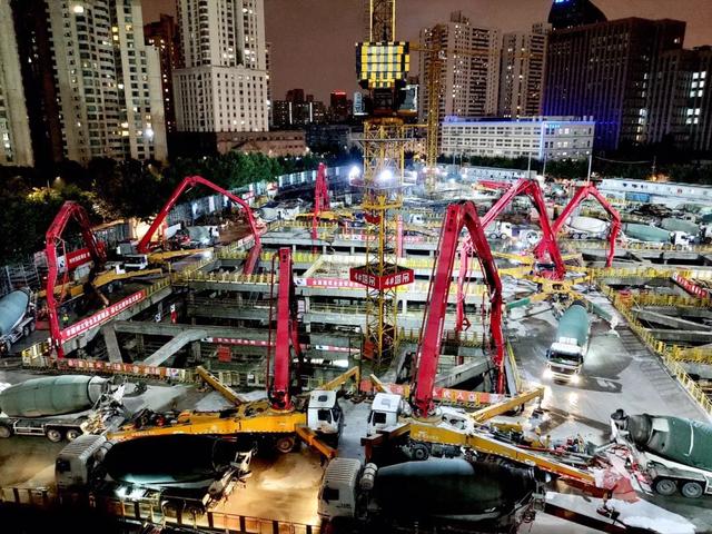 上海“浦西第一高楼”——徐家汇中心虹桥路地块高达370米的T2塔楼工程,其最深达37.2米的主塔楼混凝土大底板中的最大也是最后一块(厚6米、约2.7万立方),历经上海建工建设者48个小时的冒雨连续浇筑,于2019年7月14日上午6点30分成功“筑底”。这标志着上海建工创造出了迄今为止上海房屋建筑最深、离运营地铁最近的大体积基础混凝土底板浇筑新纪录。
