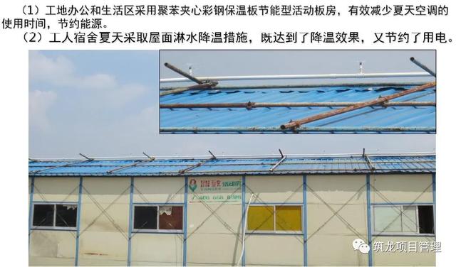 ②办公区采用集装箱搭建,1栋11间2层。管理人员宿舍采用集装箱搭建,2栋5间2层。另内设管理人员食堂、集中式厕所和淋浴间、小卖部等便民设施,局部有景观绿化。