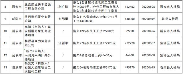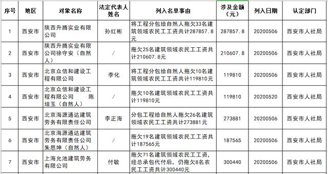 陕西省房屋建筑和市政基础设施工程领域2020年第二批拖欠农民工工资“黑名单”信息表