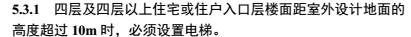 随着浙江省逐渐进入老龄化社会,老年人口迅速增加,其“上下楼困难”的问题日益突出,广大人民群众和新闻媒体都十分关注。为此,标准第5.3.1条强制规定“四层及四层以上住宅或住户入口层楼面距室外设计地面的高度超过10m时,必须设置电梯”,从源头上解决老年人的出行障碍,更好地满足老年人参与社会生活的需要。