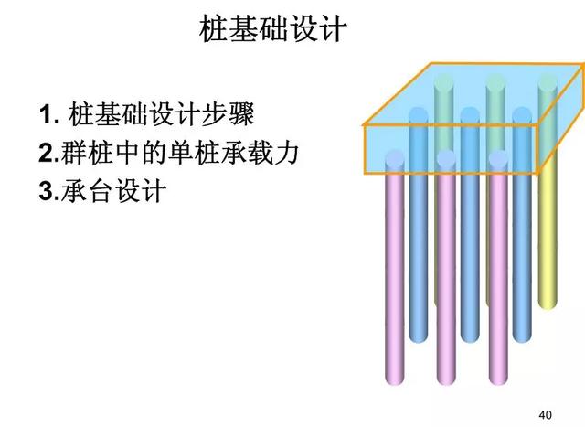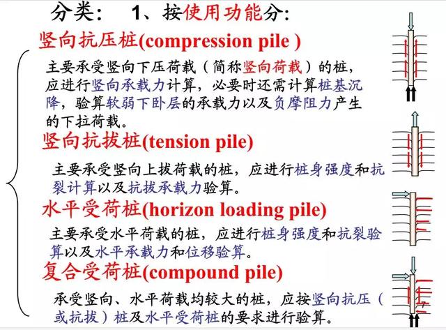 桩基础的作用是将荷载传至地下较深处承载性能好的土层,以满足承载力和沉降的要求。桩基础的承载能力高,能承受竖直荷载,也能承受水平荷载,能抵抗上拔荷载也能承受振动荷载,是应用最广泛的深基础形式。