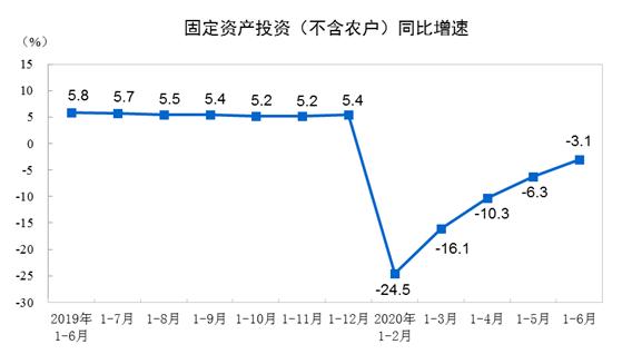 1-6月份,全国固定资产投资(不含农户)281603亿元,同比下降3.1%,降幅比1-5月份收窄3.2个百分点。其中,民间固定资产投资157867亿元,下降7.3%,降幅收窄2.3个百分点。从环比速度看,6月份固定资产投资(不含农户)增长5.91%。
