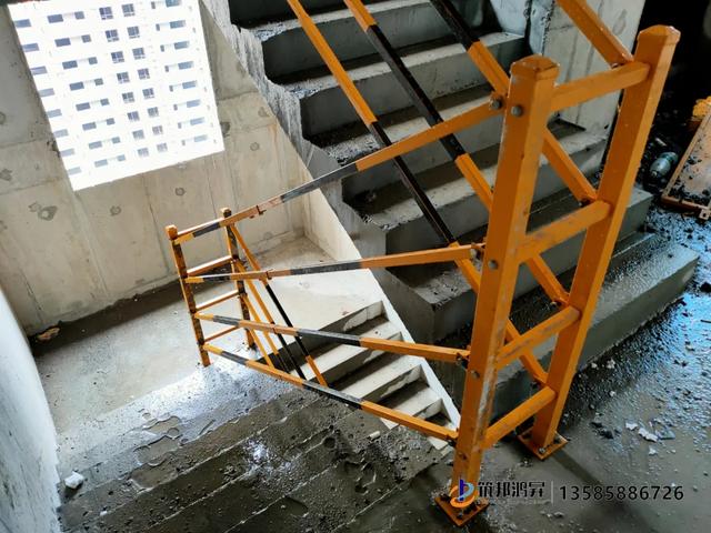 分层施工的楼梯口安装钢管式或定型化防护栏杆,上杆离地高度不小于1.2m,下杆离地高度不大于0.6m。两种防护栏杆均采用螺栓紧固,安全便捷,定型化栏杆的长度还可伸缩调整。