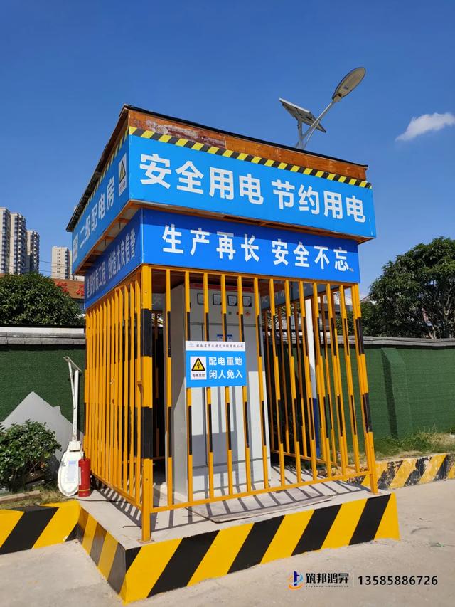 施工现场临时用电配电箱采用全钢结构防护棚,顶部双层防护,配套侧门可上锁,整体拼装方便、使用安全牢靠。