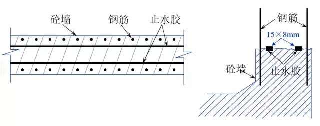 施工缝采用的遇水膨胀止水胶膨胀率不小于150%,性能满足设计要求。使用量充足,断面尺寸满足设计图纸要求。止水胶施工完成后,采用塑料膜做好成品保护,避免雨水浸泡导致膨胀失效,保证砼浇筑前合格率100%。浇筑砼后,止水胶膨胀量能将施工缝处的空隙充分填充。
