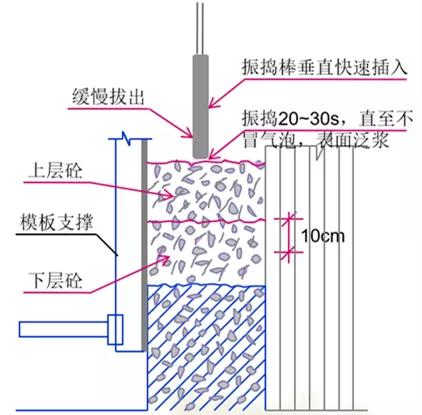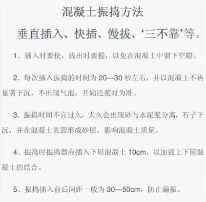 每个施工段不少于2个振捣棒,数量满足砼浇筑时振捣的要求。现场砼振捣严格按照按操作规程进行砼振捣。