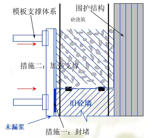 砼结构施工时,对侧墙模板底部缝隙进行了严格排查和控制,一是加强底部模板支撑,二是排查模板缝隙,进行封堵处理。通过采取上述措施,后续施工的结构侧墙模板底部缝隙处理严实,砼浇筑时未发生漏浆现象。
