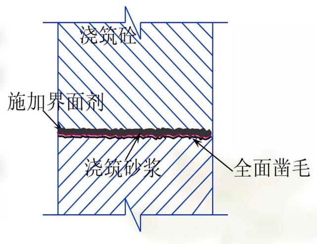 砼结构施工时,对水平施工缝砼基面凿毛进行严格控制,一是进行全面凿毛,二是保证凿毛深度1~2mm,三是清理浮浆颗粒,四是施加水泥基界面剂。通过采取上述措施,凿毛面积比例达到100%,凿毛深度2mm,砼表面无浮浆颗粒,保证了新旧砼面接触充分。