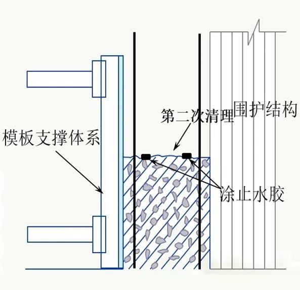 砼结构施工时,涂止水胶之前和浇筑砼前分别对水平施工缝砼基面杂物和垃圾进行彻底清理。通过采取上述措施,在后续结构砼浇筑时水平施工缝砼基面干净无垃圾和杂物,保证了新旧砼的紧密结合。