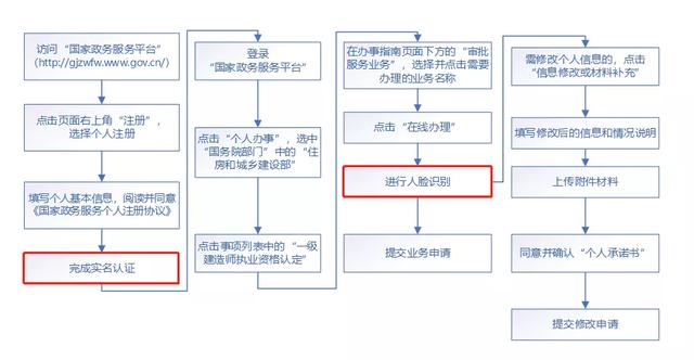 申请人在国家政务服务平台注册账号并完成实名认证后,通过人脸识别进入所选事项办理页面。若需修改个人信息的,通过“个人信息修改或补充材料”页面,提出申请。(具体申报流程见下图)
