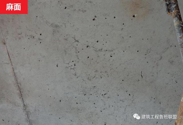 麻面主要表现是混凝土浇筑后空气排除不干净,或是由于混凝土浆液渗漏造成混凝土的表面有凹陷的小坑和表面不光滑、不平整的现象。结构构件表面呈现无数的小凹点且无钢筋暴露的现象。