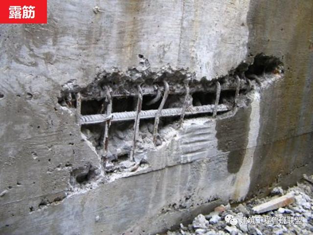 混凝土浇筑过程中振捣不到位,保护层垫块没有设置或者固定不牢固,混凝土坍落度小、拆模过早、硬化前受外力受到破坏,成型后钢筋外露的现象。