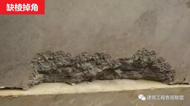 现象:梁、柱、板、墙和洞口直角处砼局部掉落,不规整,棱角有缺陷。