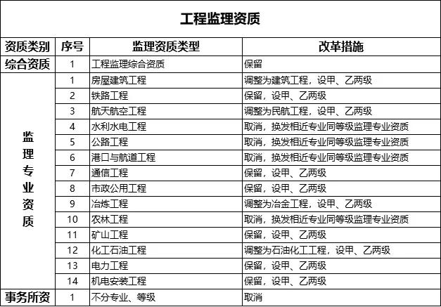 工程监理资质类别和等级34项;(压减为21项,压减38%)