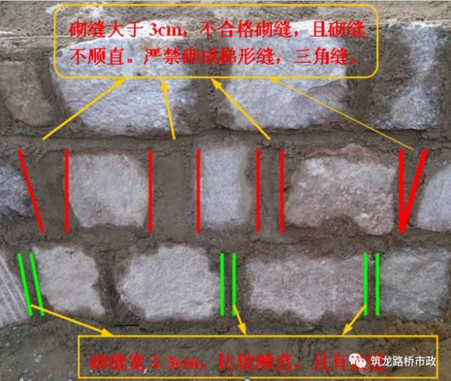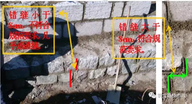 2.3 外层角隅石和镶面石要丁顺相间地与里层砌块立交接成一体,上下层石块也应交错排列,避免竖缝通缝。上下层砌缝错开距离原则上不小于8cm。