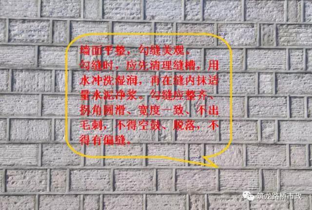 3.2 勾缝前,先清理缝槽,用水冲洗湿润,再涂抹砂浆。勾缝应整齐、拐角圆滑、宽度一致、不出毛刺,不得空鼓、脱落,不得有偏缝。水平缝与竖直缝应深浅一致、密实光滑,搭接处平整,不能有丢缝、瞎缝现象。