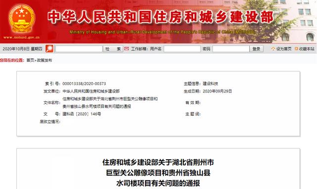 近期,住建部会同有关部门对媒体和群众反映强烈的湖北省荆州市巨型关公雕像项目和贵州省独山县水司楼项目进行了调查并发布通报。
