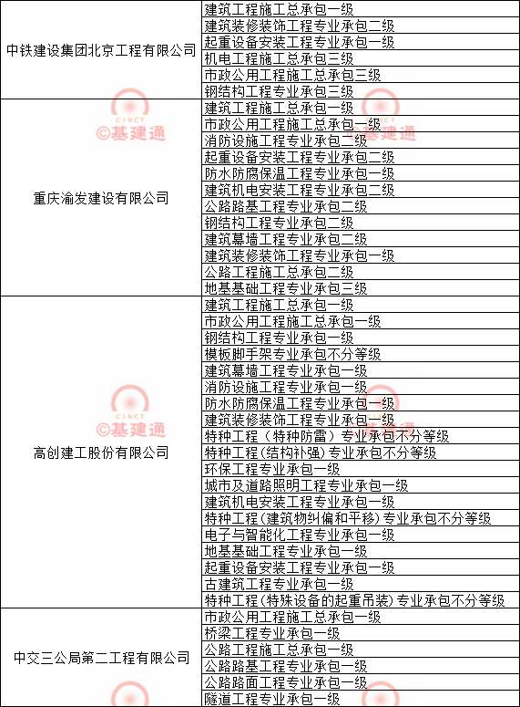 建筑工程施工总承包特级:中铁建设集团北京工程有限公司、重庆渝发建设有限公司、高创建工股份有限公司