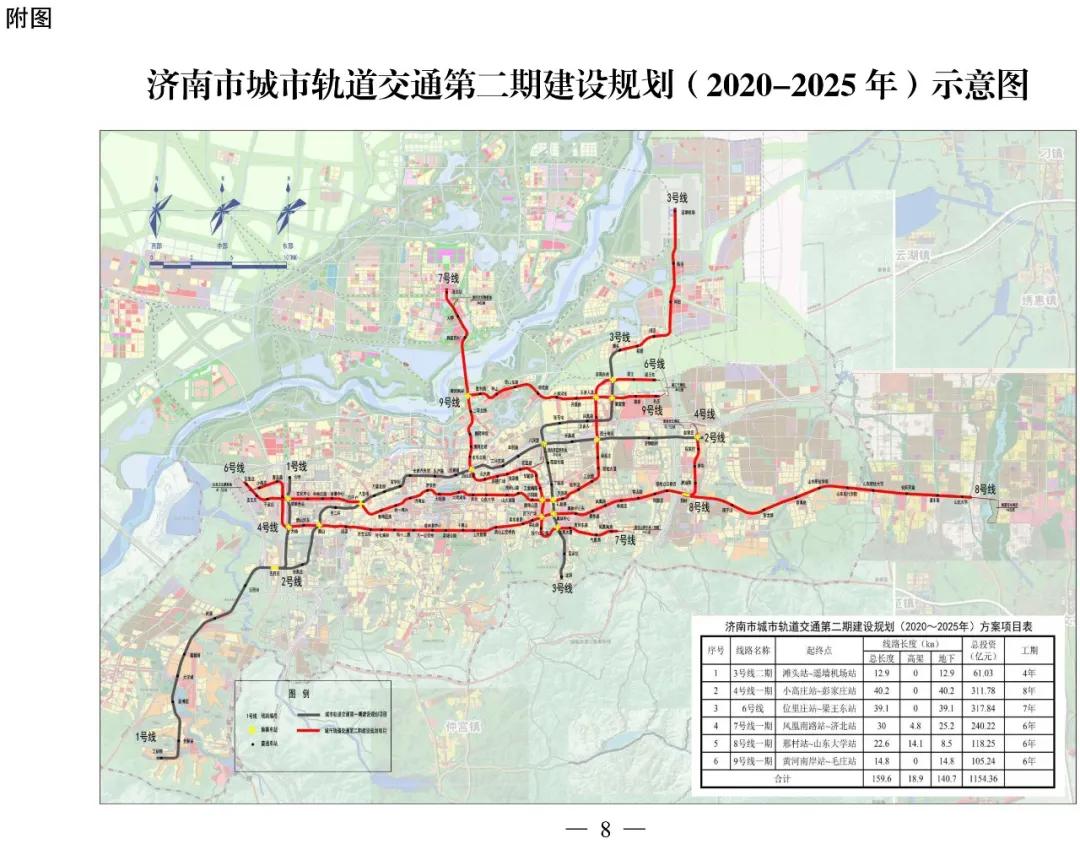原则同意济南市城市轨道交通第二期建设规划,建设3号线二期:起自一期工程滩头站后,终于遥墙机场站,线路长12.9公里,估算投资约61.03亿元,项目建设工期为4年。4号线一期:起自小高庄站,终于彭家庄站。线路全长40.2公里,估算投资约311.78亿元,项目建设工期为8年。6号线:起自位里庄站,终于梁王东站。线路全长39.1公里,估算投资约317.84亿元,项目建设工期为7年。7号线一期:起自凤凰南路站,终于济北站。线路全长30.0公里,估算投资约240.22亿元,项目建设工期为6年。8号线一期:起自邢村站,终于山东大学站。线路全长22.6公里,估算投资约118.25亿元,项目建设工期为6年。9号线一期:起自黄河南岸站,终于毛庄站。线路全长14.8公里,估算投资约105.24亿元,项目建设工期为6年。