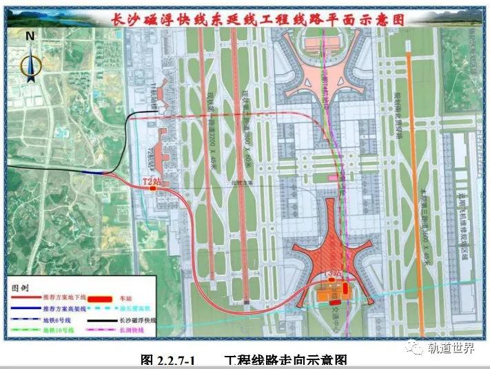 线路自长沙大道与临空大道西北侧既有长沙磁浮快线接出,以高架形式上跨临空大道后,从省机场管理集团北侧山地转入地下,向东敷设,至T2航站楼西南侧停车场设磁浮T2站;出站后沿第一跑道西侧走行,至第一跑道南端避开跑道折向东,接入拟建T3航站楼设磁浮T3站, 并预留进一步延伸至浏阳的条件 。线路全长4.448公里,其中高架段长0.224公里,地下段长4.224公里,设站2座,均为地下站,含换乘站1座 ,车辆采用3辆编组中低速磁浮列车,最高运行速度为100公里/小时 ,建设工期为47个月 。