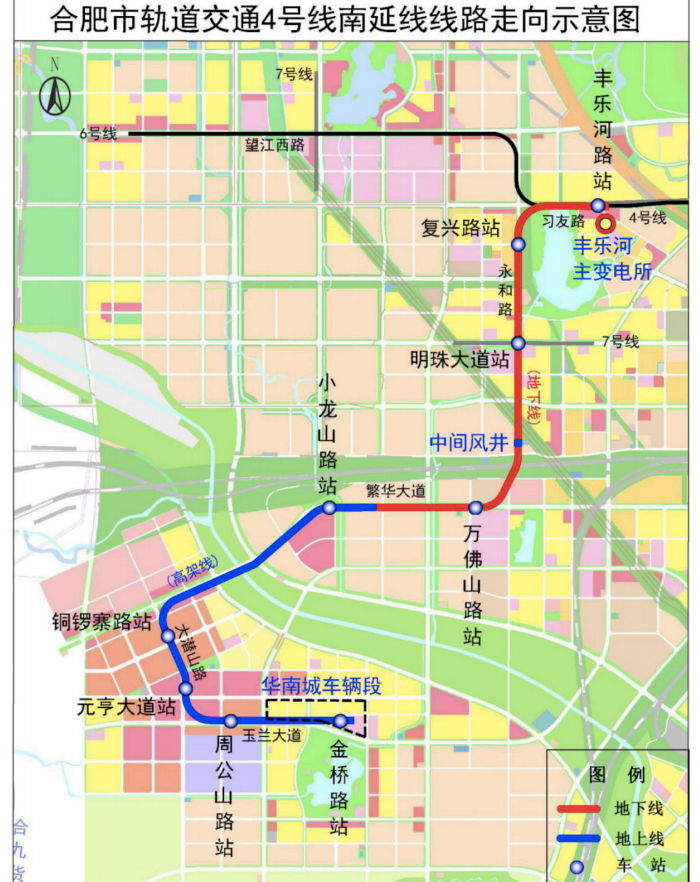 项目概况:合肥轨道交通4号线南延工程线路主要位于肥西县、部分位于高新区境内,线路起于金桥路站,接入在建的丰乐河路站。线路全长13.97公里,其中地下线6.55公里,高架线7.11公里,过渡段0.31公里。一共设8座车站,其中高架站5座