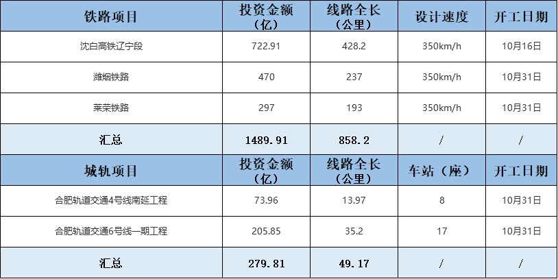 新增开工5项:包含铁路3项,总投资额1489.91亿,线路全长858.2km,设计时速350/h;城轨项目2项,总投资额279.81亿,线路全长489.17km。