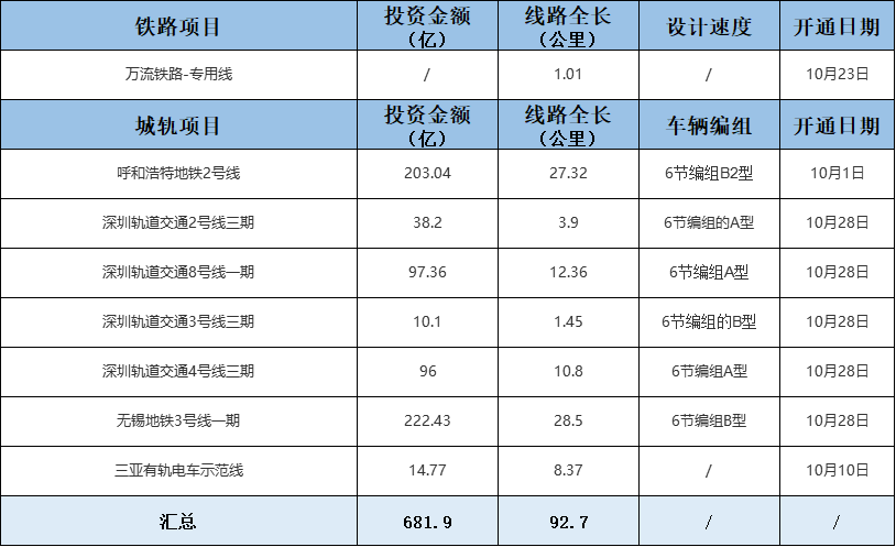 新增运营8项,铁路仅一项,城轨项目共7条线路开通,总投资额671.9亿元,线路汇总全长92.7km。