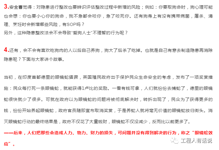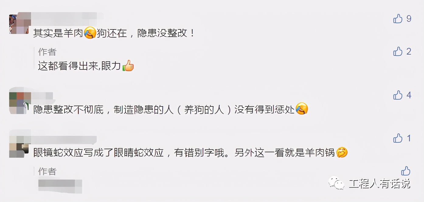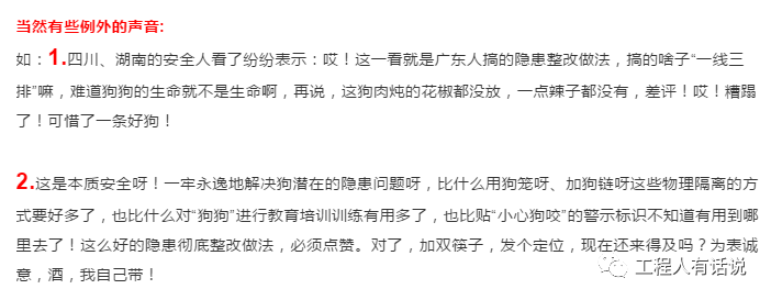 这两天这个隐患整改前后对比的照片,刷的一下就上了安全人朋友圈的热门。当然,更多的是调侃,对于多数人来说,安全工作枯燥乏味,单调无趣,好不容易有这一“爆料”,独乐乐不如众乐乐,于是一时间朋友圈,微信群,狗肉图片与段子齐飞,秋水共长天一色。搞得有些人忘记了隐患本身,眼睛盯着那锅狗肉,唾液在嘴里肆意横生,差点就掉在手机屏幕上啦。一时间,安全人忘记了工作的“苦水”,直咽“口水”。如果巴甫洛夫若还在世的话,肯定又会多一个研究成果:不会炖狗肉的安全人不是一个好段子手。