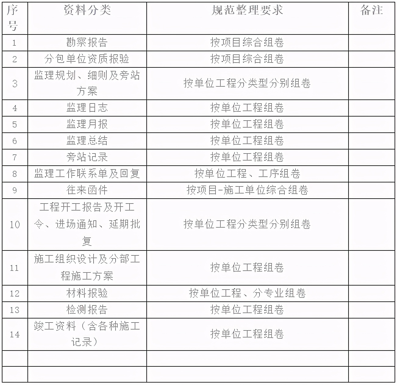 日常收集整理:按项目-单位工程进展先后所形成的资料类型装盒,按《工程技术资料归档移交规范整理要求列表》分类组卷。