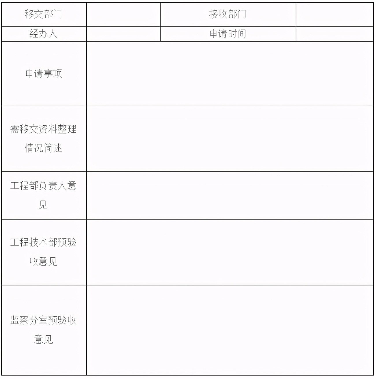 项目竣工后,工程部必须向当地城建档案馆移交竣工资料,并同时应向监察室移交除一套完整的竣工资料(包含工程准备阶段、监理资料、施工过程资料、竣工验收资料及竣工图)外,还需要将该项目工程建设过程性管理资料移交保管。具体移交内容及对象如下: