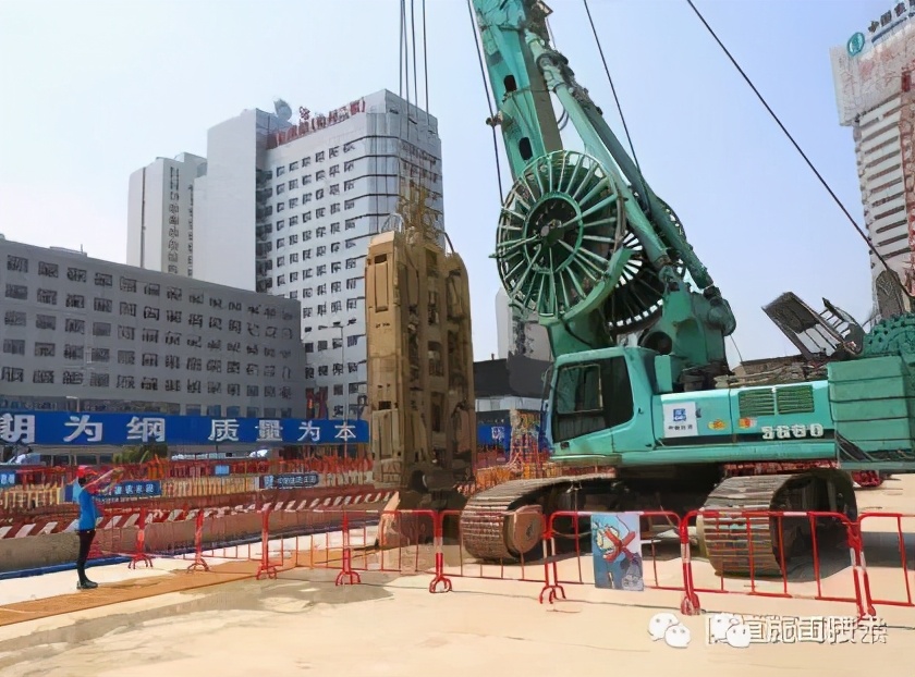 导向墙完成后,成槽机大显身手来施工地下连续墙啦。成槽机长长的手臂直伸入20到30m深的地下,说时慢那时快,地质情况好时,3天2幅槽段,速度是杠杠的。这当然还要归功于我们技术一流的操作人员啦,别忘了人家是持证上岗的,当然还有作业时旁站指挥的专门安全人员啦。另外我们的防护也是立马跟上,为防止周边安全隐患,成槽机作业半径内采取铁马+盖板防护。