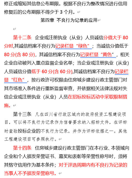 当企业或注册执业(从业)人员诚信分值低于60分(含60分),其诚信档案不良行为记录栏显“红色”,按行政许可权限由住房城乡建设行政主管部门对其市场准入条件进行重新监督审查,并依据相关法律法规对失信企业或注册执业(从业)人员在招标投标活动中采取限制措施。