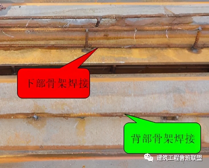 在止水钢板上下用φ10直接焊接钢筋骨架,绑好钢丝网,通过计算,除去底板保护层厚度,底板钢筋、温度筋直径,其上下骨架高度为13.4cm,支架间距300,安装时再焊接在底板上下部钢筋上。