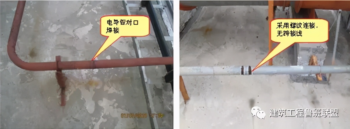 电导管无论厚薄都不允许直接对口焊接,由于对口焊接易在管內壁形成焊瘤或刀状错口,给管内穿线造成困难,甚至会破坏绝缘层发生短路等触电安全事故。镀锌钢管接地采用焊接方式,破坏了锌保护层,保护层不仅是外表面,还包括内壁表面,如果焊接接地线用熔焊法,则必然破坏内外表面的锌保护层,外表面尚可用刷油漆补救,而内表面则无法刷漆进行防腐。违背了施工设计采用镀锌材料的初衷。
