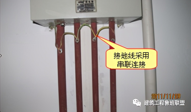 接地线是起保护作用,若接地线采用串联连接,粗看起来,似乎金属电导管均接有保护接地线,仔细分析却存在着隐患。假如上图中的某一管路的接地螺拴松脱或断线,则在它以后的各导管所接的地线均会处于悬浮状态,一旦发生漏电,将会十分危险。