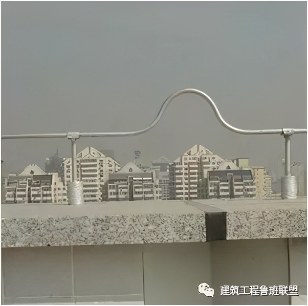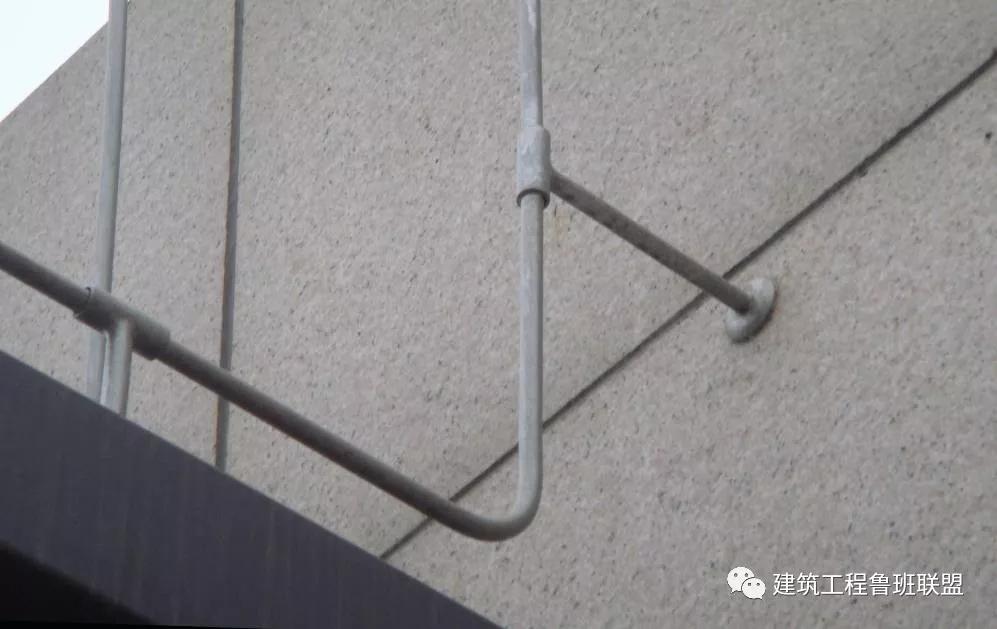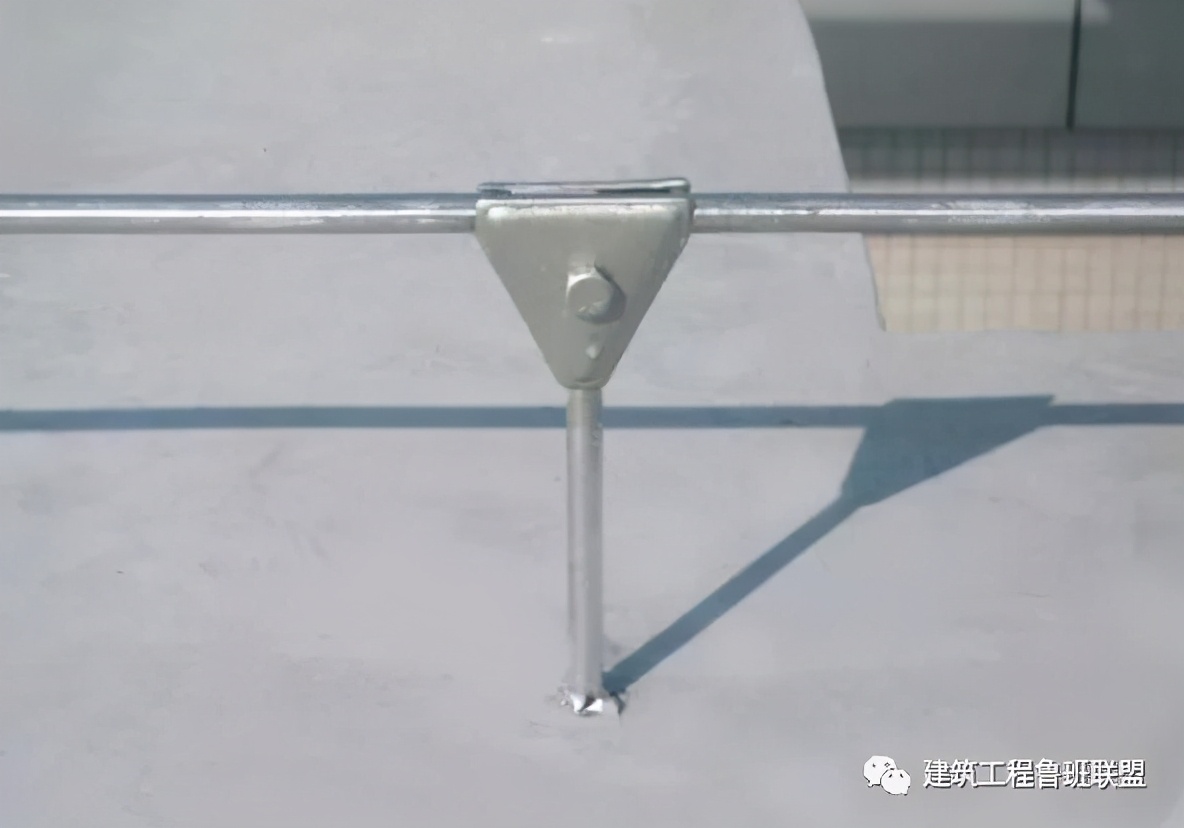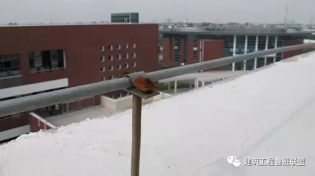 (1)支撑点与避雷网不用焊接方式,用比镀锌圆钢略大一点的套管制作卡具,镀锌后安装在女儿墙上。既让镀锌圆钢穿过去减少了焊点,保护镀锌层,增加使用寿命,也可让避雷网自由伸缩。