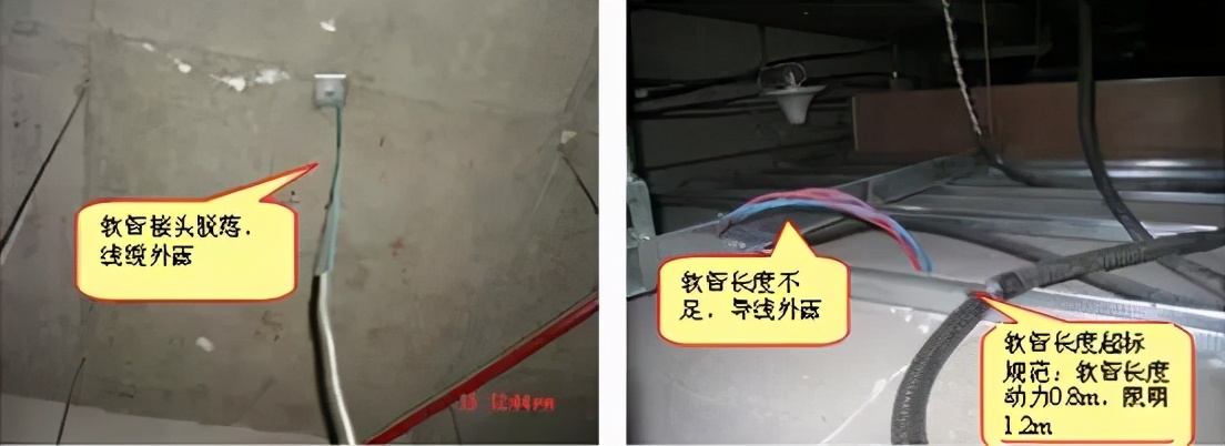 软管配管过长,敷设不到位或脱落,软管进盒没有专用接头,导线外露